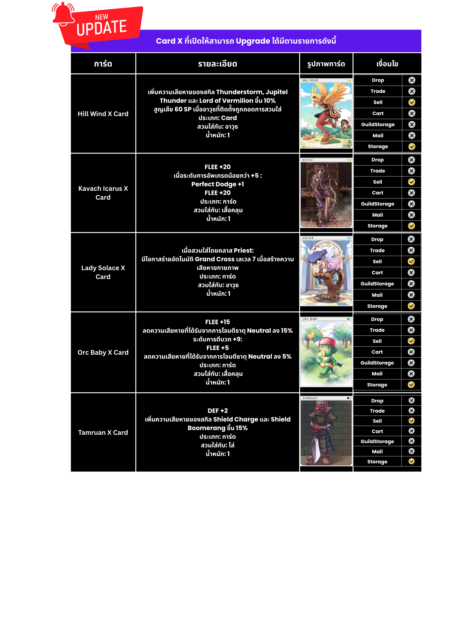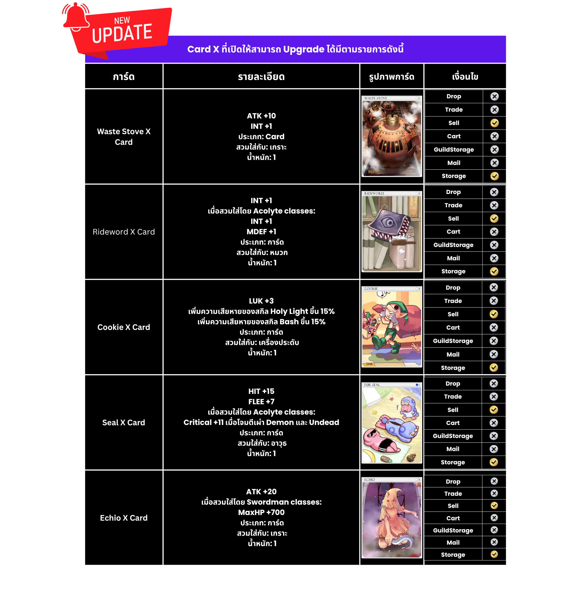 - ส่วนของการ์ด X จะเป็นการอัปเดตรายการการ์ดที่สามารถอัปเกรดได้เพิ่ม
