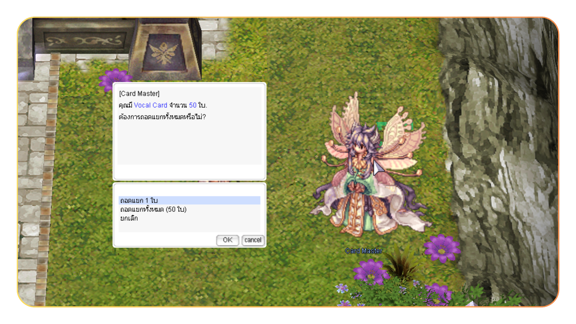- พูดคุยกับ NPC Card Master พิกัด Izlude 82,215 โดยกดเลือกที่เมนู Disassemble Card ระบบจะแสดงรายการการ์ดที่ผู้เล่นมีในตัว