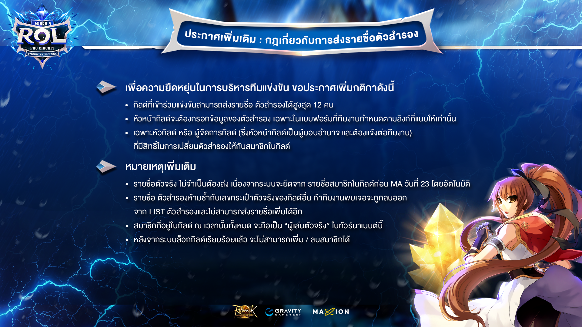 - รายชื่อตัวจริง ไม่จำเป็นต้องส่ง เนื่องจากระบบจะยึดจากรายชื่อสมาชิกในกิลด์ก่อน MA วันที่ 23 โดยอัตโนมัติ
