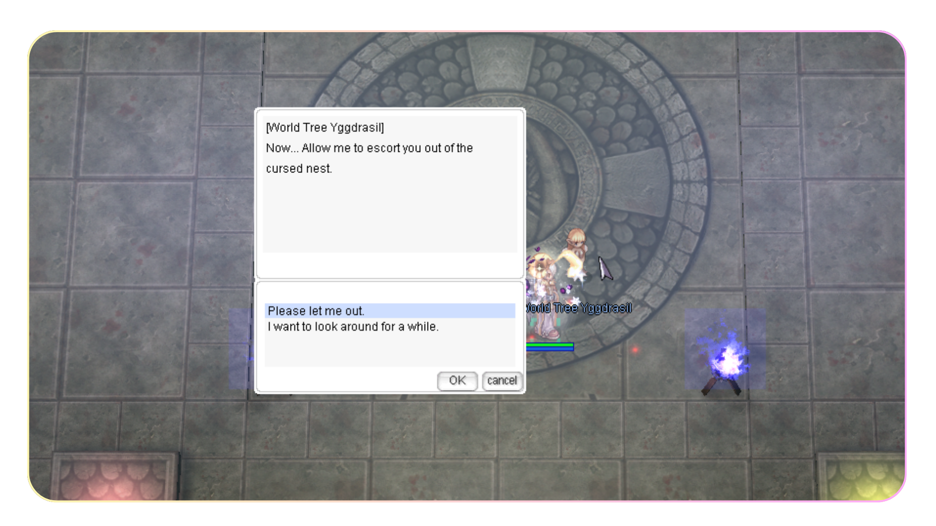หลังจากสร้าง Instance สำเร็จ ให้หัวหน้าปาร์ตี้พูดคุยกับ Yggdrasil Gatekeeper อีกครั้งเพื่อเข้าสู่ดันเจี้ยน