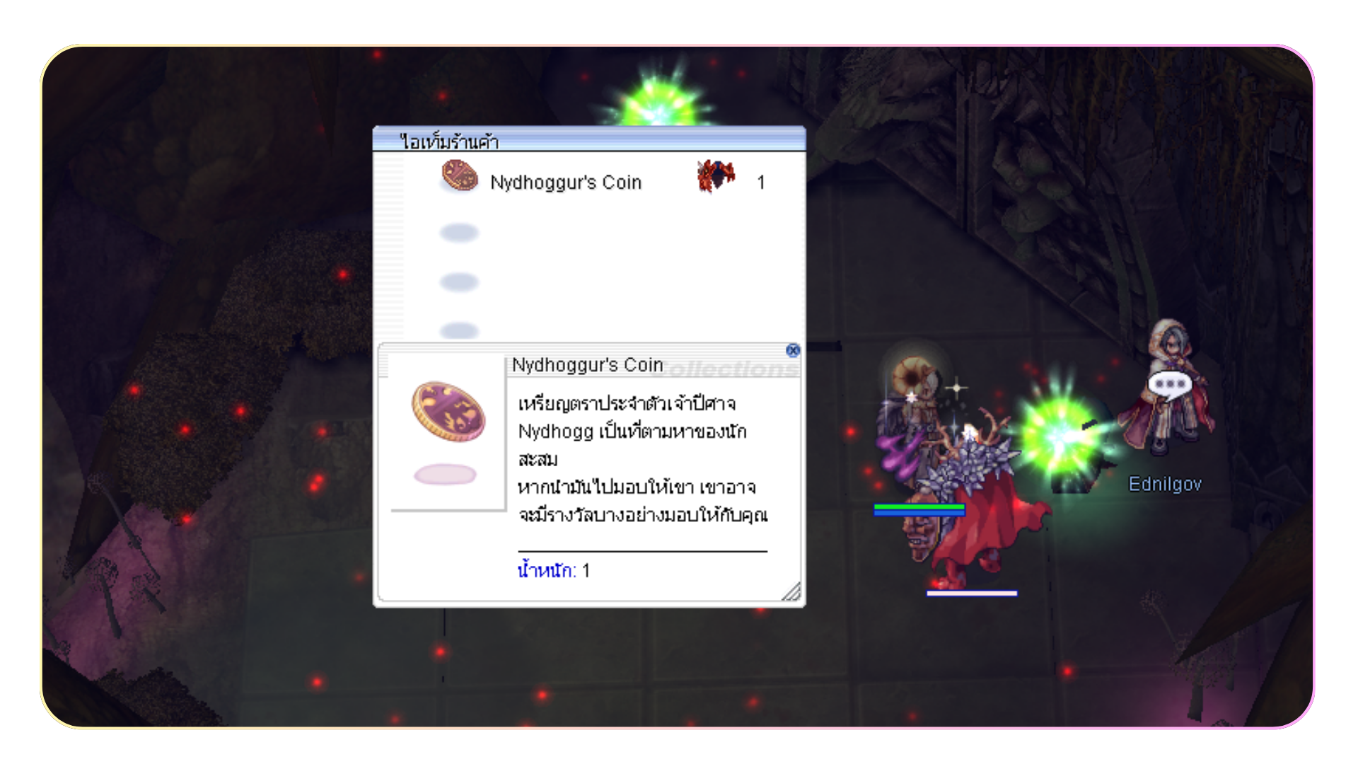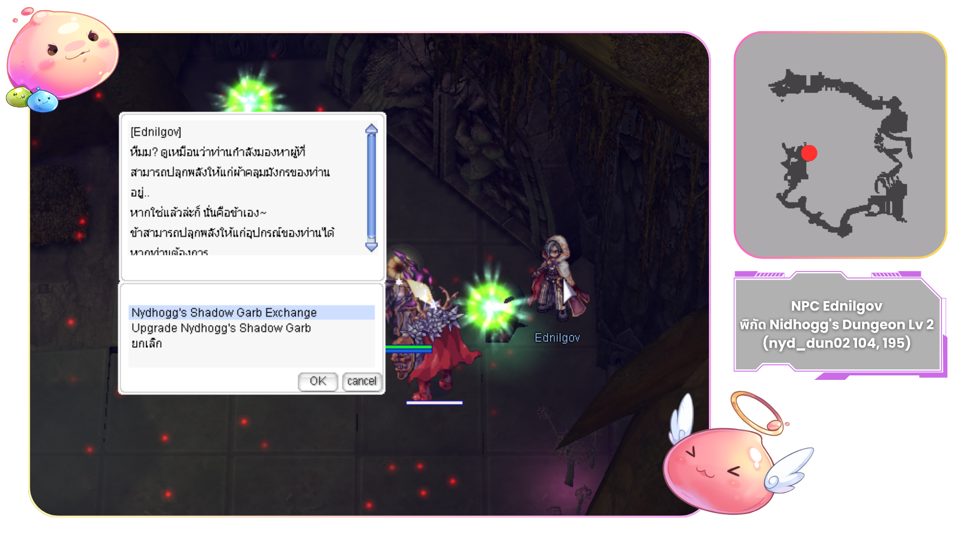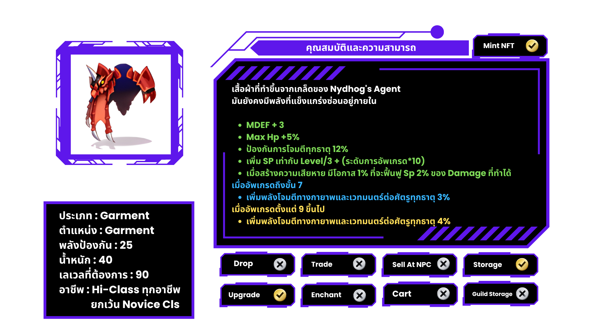 | Nidhoggur’s Shadow Garb [1] | ทำมาจาก เกล็ดของ Nidhoggur’s Shadow ซึ่งยังคงมีพลังที่แข็งแกร่งอยู่ คุณสมบัติไอเทม ประเภท: เครื่องสวมใส่ส่วนหลัง (Garment / ผ้าคลุม) พลังป้องกัน (DEF): 25 น้ำหนัก: 40 เลเวลที่ต้องการ: 90 อาชีพที่ใช้ได้: Lord Knight, Master Smith, Assassin Cross, High Priest, High Wizard, Sniper, Paladin, Biochemist, Stalker, Champion, Scholar, Minstrel, Gypsy . เอฟเฟกต์พื้นฐาน Mdef + 3 ลดความเสียหายที่ได้รับจากการโจมตีทุกธาตุลง 7% เพิ่ม Max SP ตามสูตร: (Base Level / 3) + (Upgrade Level x 10) เมื่อทำการโจมตีทางกายภาพ มีโอกาส 1% ที่จะฟื้นฟู 1% ของความเสียหายที่ทำได้ กลับมาเป็น SP |