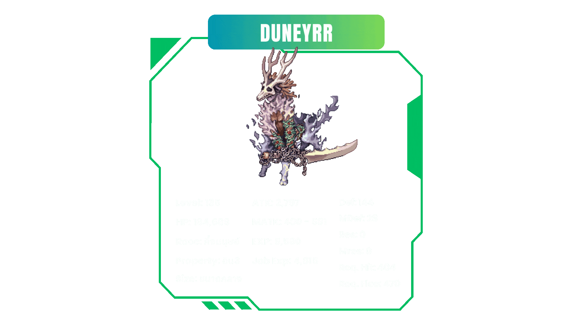 ประเภท: การ์ด (Card) ใช้สวมใส่กับ: เครื่องสวมศีรษะ (Headgear) น้ำหนัก: 1 . เอฟเฟกต์พื้นฐาน ATK + 10 เมื่อทำการ โจมตีทางกายภาพ มีโอกาสบัฟผู้ใช้เป็นเวลา 4 วินาที โดยได้รับ Perfect Dodge + 10 |