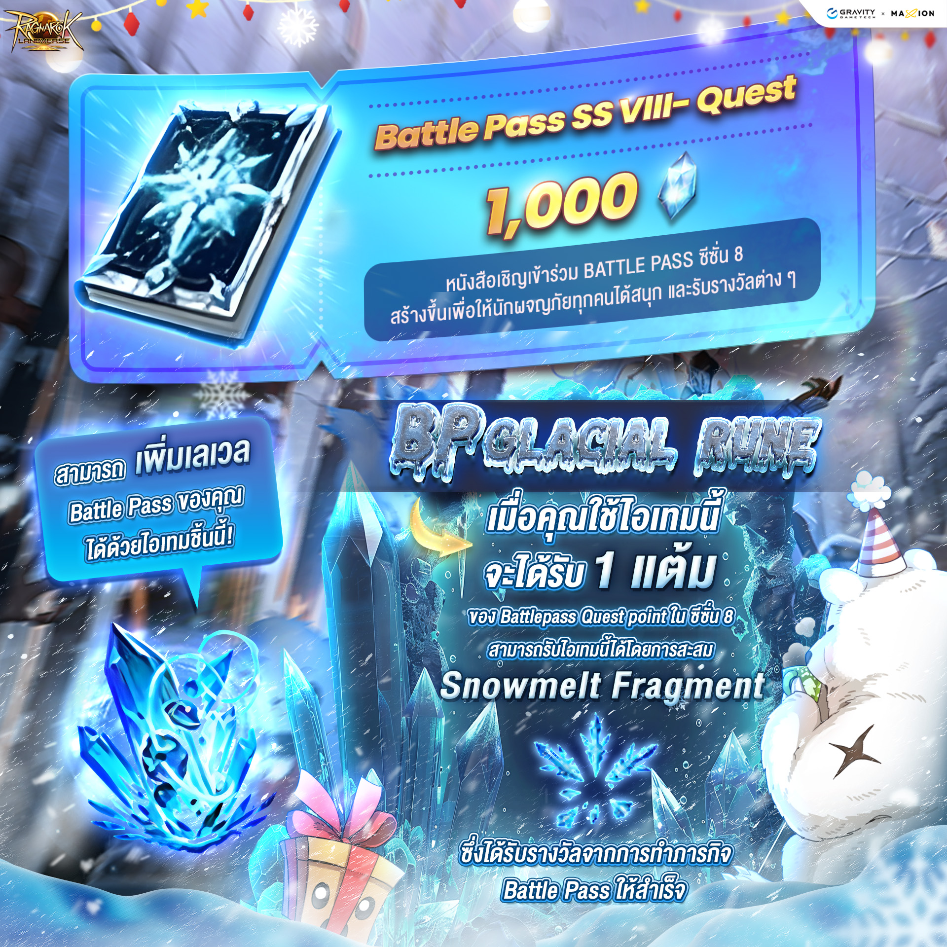 Battle Pass – Quest : เข้าร่วม Battle Pass Season 8 ด้วยหนังสือเชิญ Battle Pass SS VIII – Quest และรับรางวัลมากมาย โดยใช้ BP Glacial Rune เพื่อเพิ่มระดับ Battle Pass ของคุณ