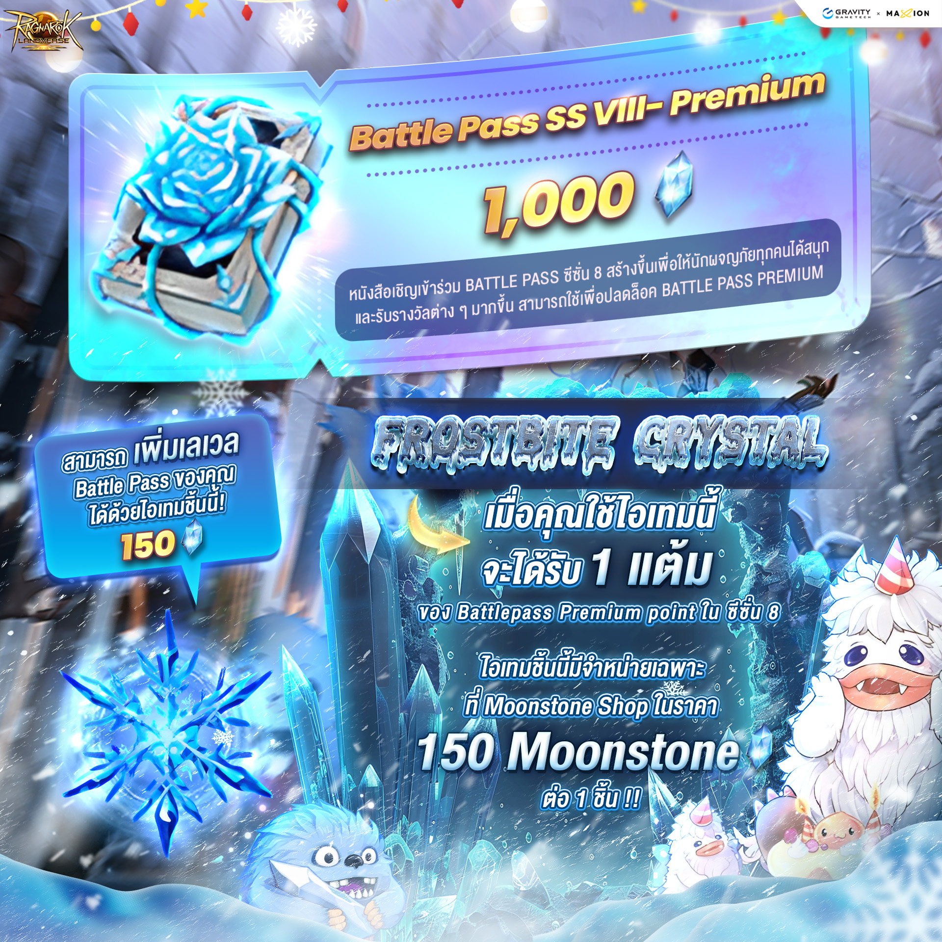 เตรียมตัวให้พร้อม แล้วมาค้นหาความลึกลับที่ซ่อนอยู่ใน Battle Pass Season 8 Winter Veil!! ปลดล็อก Battle Pass ได้ที่ Moonstone Shop ในราคา 1,000 Moonstone