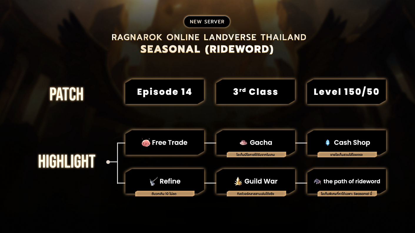 ทั้งนี้ ยังมีรายละเอียดและการอัปเดตอื่น ๆ ที่จะทยอยประกาศเพิ่มเติมในอนาคต สามารถติดตามข้อมูลเกี่ยวกับ Seasonal Server “Rideword” ได้เร็ว ๆ นี้