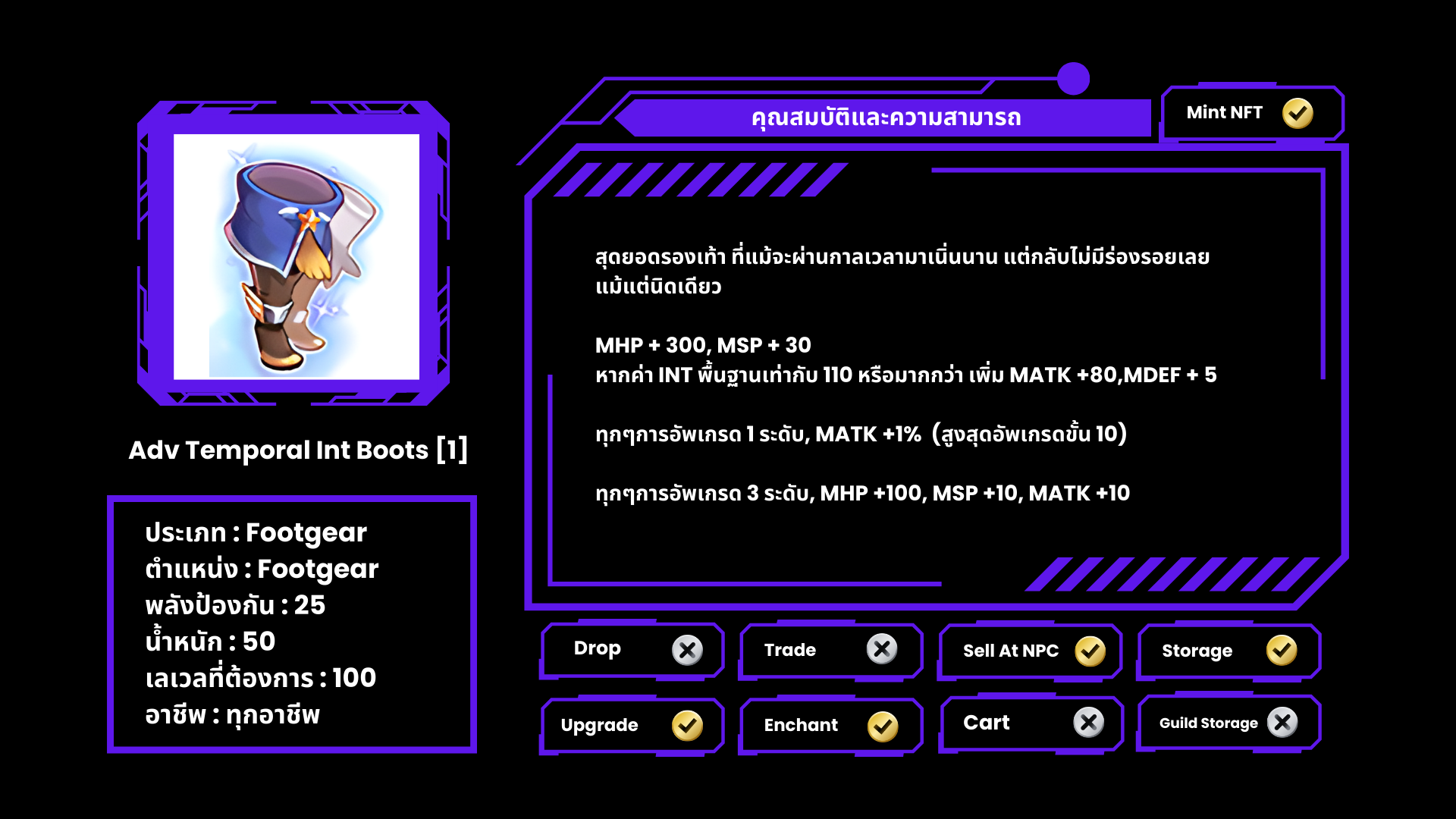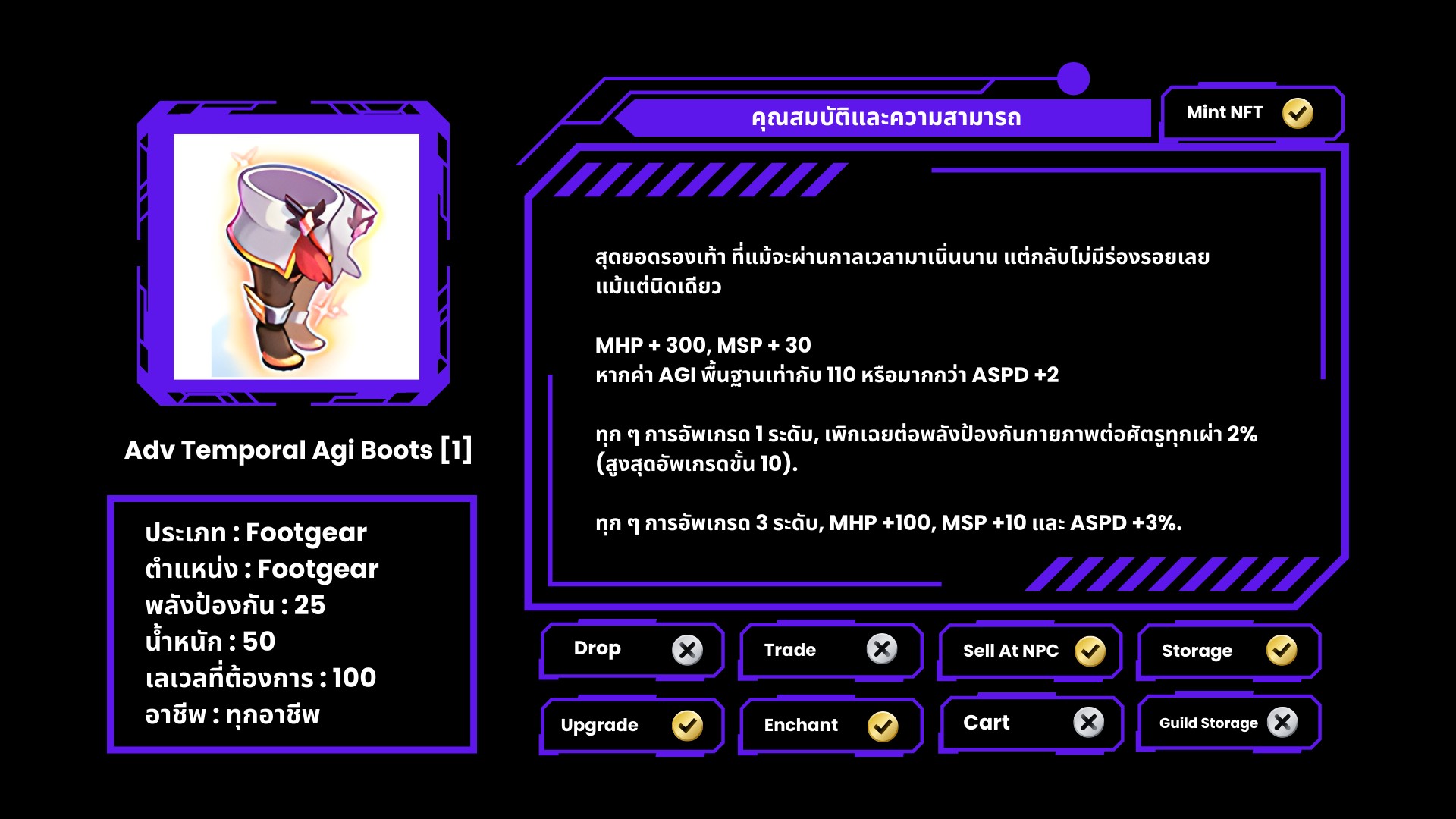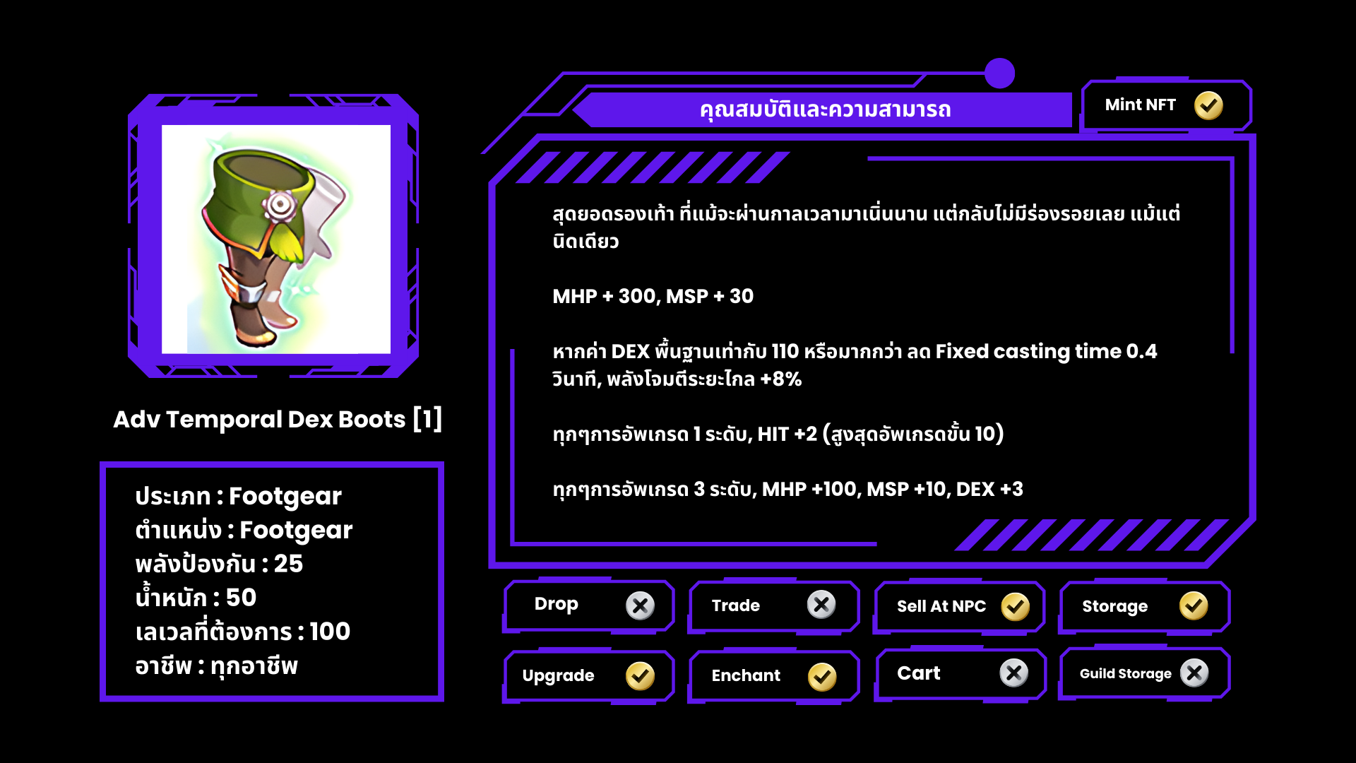 NPC จะมอบ Adv Temporal Stat Boots [1] ให้กับผู้เล่นแทนรองเท้าคู่เดิม