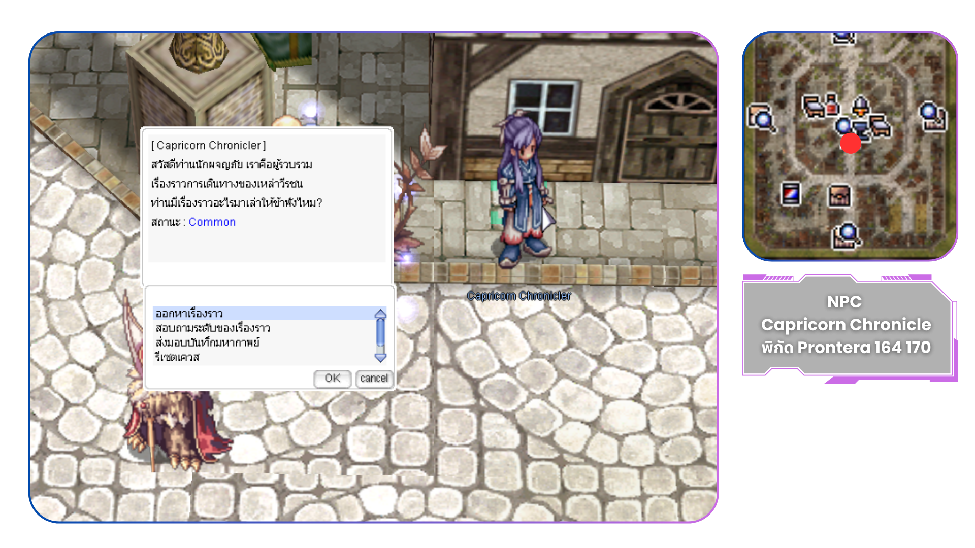พูดคุยกับ NPC Capricorn Chronicler พิกัด prontera 164, 168 โดยจะมีหัวข้อพูดคุยดังนี้