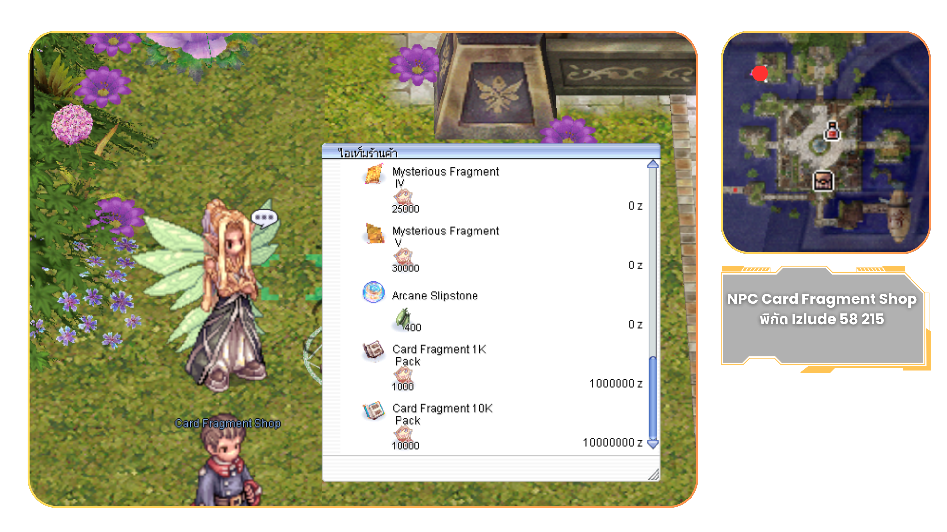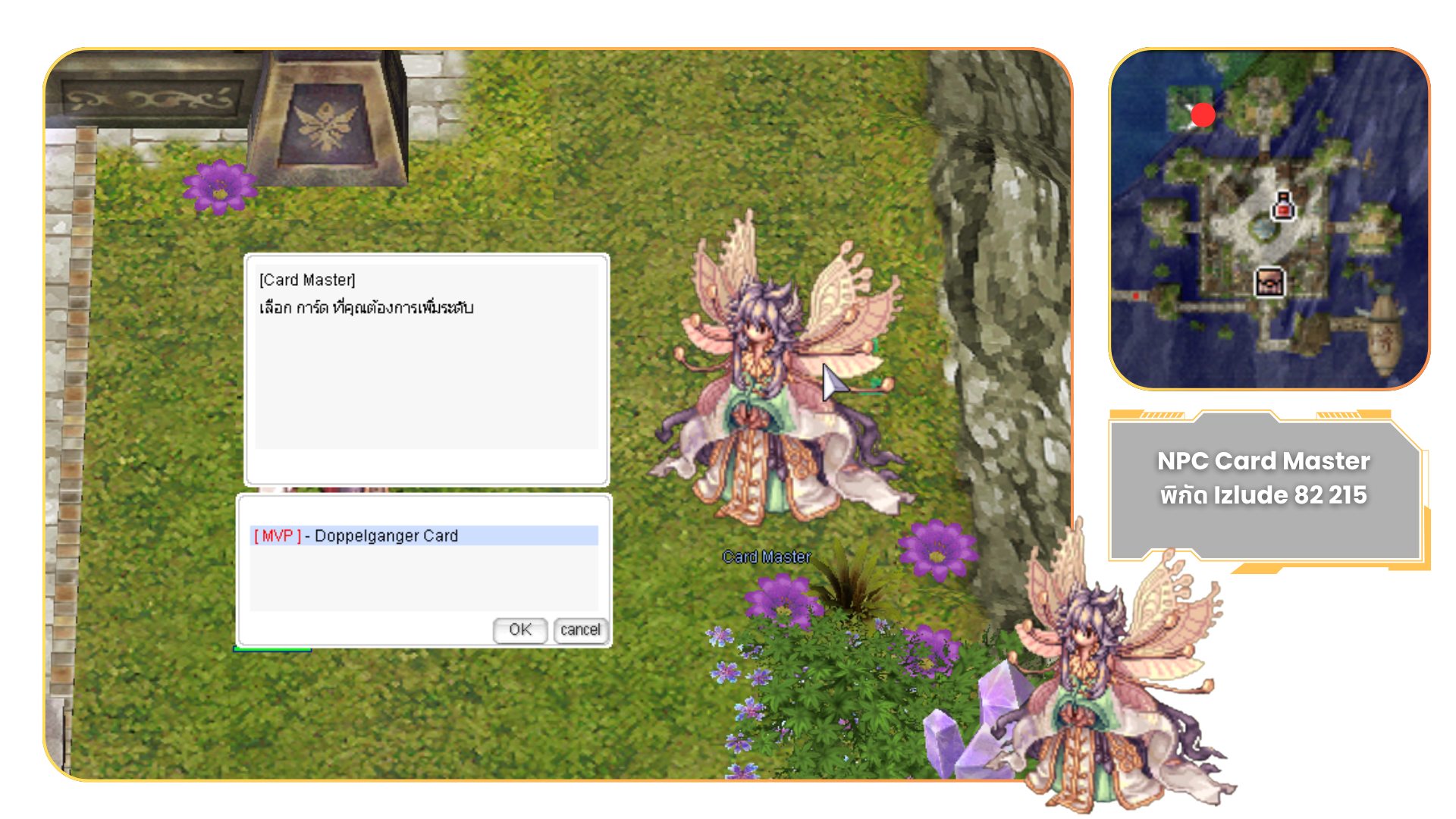 - พูดคุยกับ NPC Card Master พิกัด Izlude 82 215 กดเลือกที่เมนู “Upgrade Card” ระบบจะแสดงรายการการ์ดทั้งหมดที่ผู้เล่นมีอยู่ในตัว