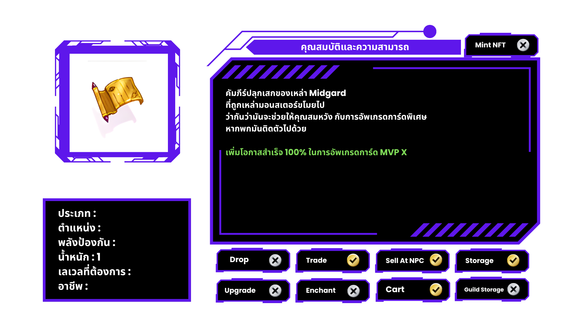 - หากผู้เล่นมี Guarantee MVP X Scroll ในกระเป๋า NPC Card Master จะสอบถามว่า “คุณต้องการใช้มันเพื่อเพิ่มอัตราความสำเร็จ 100% หรือไม่?” ผู้เล่นสามารถ เลือกได้ว่าจะใช้หรือไม่ใช้